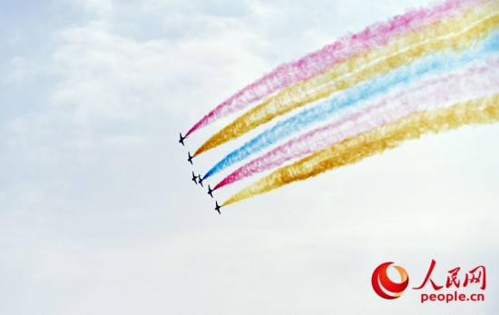 八一飛行表演隊航展現場進行飛行表演。(攝影:人民網記者 翁奇羽)