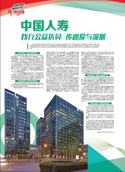 2020年是全面建成小康社会目标实现之年,也是全面打赢脱贫攻坚战收官之年。为深入贯彻落实中央决策部署,助力打赢脱贫攻坚战,中国人寿保险股份有限公司(简称“中国人寿”)持续增加对扶贫领域公益资源的投入,依托中国人寿慈善基金会加大定点扶贫及“三区三州”等深度贫困地区的帮扶支持力度,在实践中形成多套扎实有效的方案,为全面打赢脱贫攻坚战贡献力量,践行中国人寿作为金融保险央企应有的责任与担当。